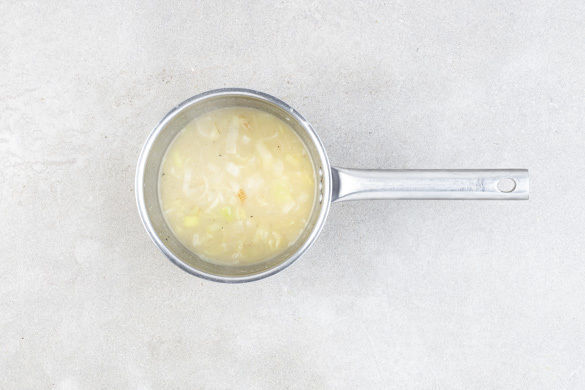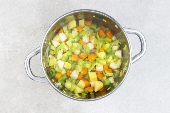 In einem mittelgroßen Topf 500ml Wasser mit dem Brühgewürz zum Kochen bringen. Die Karotten, die Petersilienwurzeln, die Kartoffeln, den grünen Lauch und ca. 1/4 der weißen Lauchstreifen in die kochende Brühe geben, mit Salz und Pfeffer würzen und ca. 10Min. bei mittlerer Hitze sanft köcheln lassen.