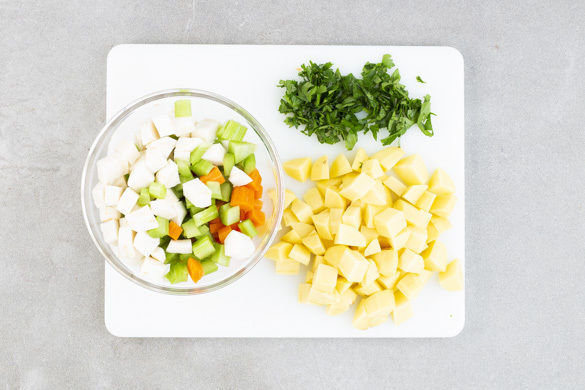 Die Karotte und die Petersilienwurzel schälen, längs vierteln und in 1–2cm große Würfel schneiden. Den Stangensellerie längs halbieren und ebenfalls in 1–2cm große Würfel schneiden. Die Kartoffeln schälen und in ca. 1cm kleine Würfel schneiden. Die Petersilie samt Stängeln fein hacken.