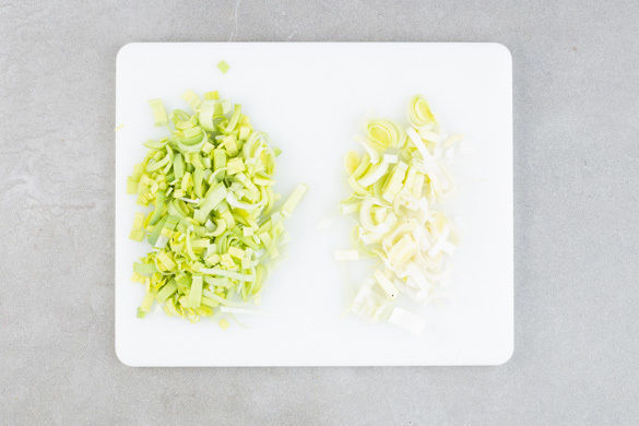 Den Lauch längs halbieren und in feine Streifen schneiden. Den grünen und weißen Teil getrennt aufbewahren.