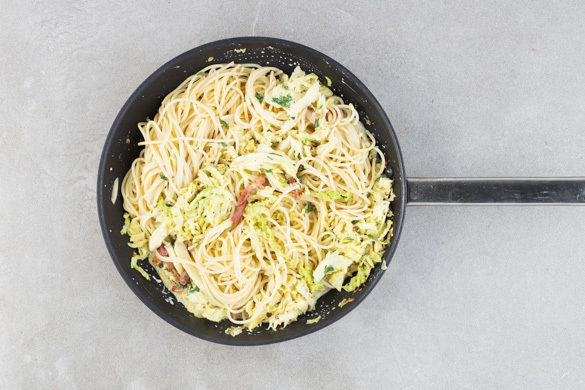 Wirsing und Speck, das sind zwei, die sich mögen. Perfekt dazu: die cremige Frischkäsesauce und beste italienische Pasta. Ein Gericht, dem niemand widerstehen kann! Aber warum sollte man auch?