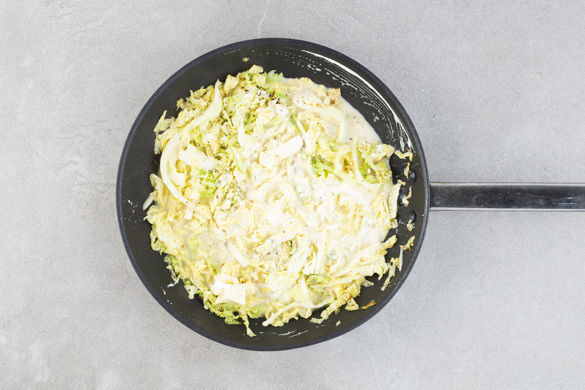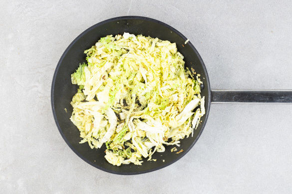 In einem mittelgroßen Topf ausreichend gesalzenes Wasser für die Pasta zum Kochen bringen. Den Wirsing halbieren, vom Strunk befreien und in dünne Streifen schneiden.