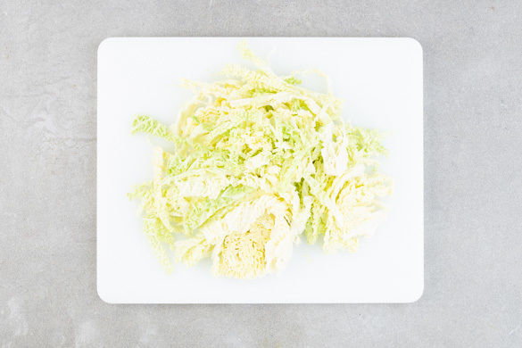 In einem großen Topf ausreichend gesalzenes Wasser für die Pasta zum Kochen bringen. Den Wirsing halbieren, vom Strunk befreien und in dünne Streifen schneiden.
