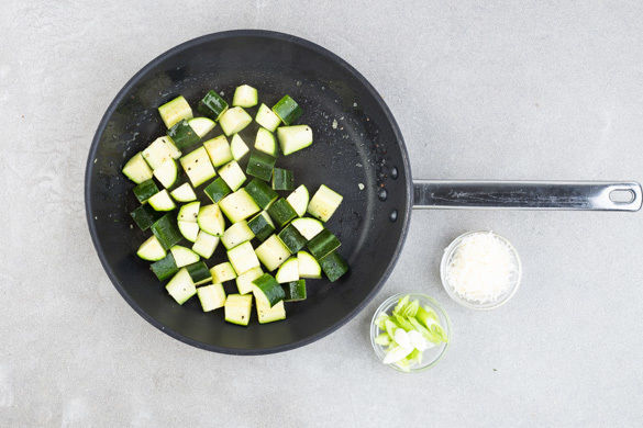 Die Zucchini in einer großen Pfanne mit 1–2EL Olivenöl bei starker Hitze 3–4Min. bissfest anbraten. Mit dem Limettenabrieb nach Geschmack sowie Salz und Pfeffer würzen. Die Lauchzwiebel in feine Ringe schneiden. Den Käse fein reiben.