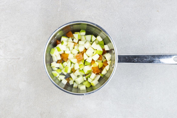 1EL Stärke mit 2–3EL kaltem Wasser verrühren. Die Apfelwürfel und die getrockneten Aprikosen in einem kleinen Topf mit der 1/2 der Stärkemischung und 1TL Zucker verrühren, dann langsam zum Kochen bringen und ca. 2Min. sanft köcheln lassen. Bei Bedarf etwas mehr Wasser hinzugeben.