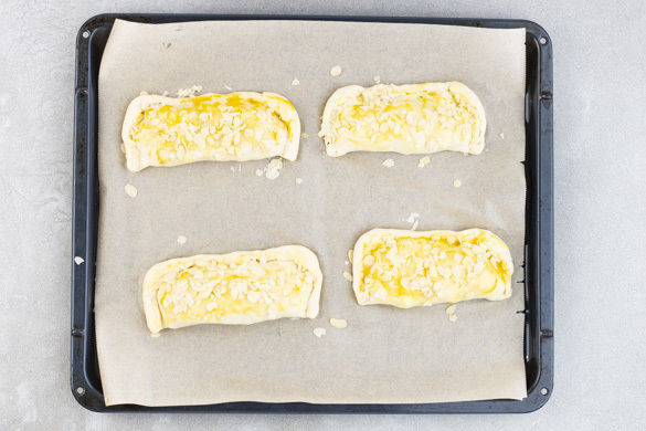 Die Teigtaschen mit den Mandelblättchen bestreuen und ca. 20Min. im Ofen backen, bis die Teigtaschen knusprig und goldbraun sind. Tipp: Wer hat, kann ein Eigelb verquirlen und mit diesem die Teigstücke bestreichen.
