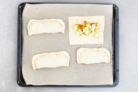 Den Teig mit dem Papier nach unten auf einem Backblech ausrollen und in 4 gleich große Stücke schneiden. 2 Teigstücke mit der Apfel-Aprikosen-Mischung belegen, die übrigen Teigstücke mit der Birnen-Feigen-Mischung. Die Teigstücke zu Taschen zusammenklappen und die Ränder mithilfe einer Gabel verschließen.