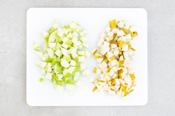 Den Backofen auf 180°C Umluft (200°C Ober-/Unterhitze) vorheizen. Die Äpfel vierteln, entkernen und in ca. 0,5cm kleine Würfel schneiden. Die Birnen vierteln, entkernen und ebenfalls in kleine Würfel schneiden.