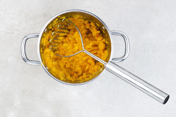 Den Kürbis halbieren, entkernen und in 2–3cm große Stücke schneiden. Den Sellerie schälen und ebenfalls in 2–3cm große Stücke schneiden. Das Gemüse in einem mittelgroßen Topf mit 1–2EL Olivenöl bei mittlerer Hitze 2–4Min. anbraten. Mit Salz und Pfeffer würzen, dann 700ml warmes Wasser angießen und das Gemüse in ca. 15Min. gar kochen.
