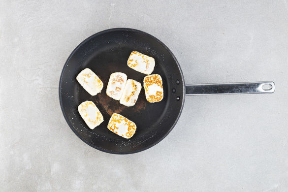 Den Halloumi in ca. 1cm breite Scheiben schneiden und in derselben Pfanne mit 1EL Olivenöl bei mittlerer Hitze auf beiden Seiten 2–3Min. knusprig anbraten.