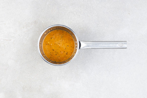 Den Knoblauch schälen und grob würfeln, dann mit den Tomatenkernen in einem kleinen Topf bei niedriger Hitze ca. 5Min. erwärmen und anschließend mit einem Stabmixer pürieren. Mit der 1/2 der Gewürzmischung, je 1 Prise Salz, Pfeffer und Zucker sowie 1EL Olivenöl abschmecken.
