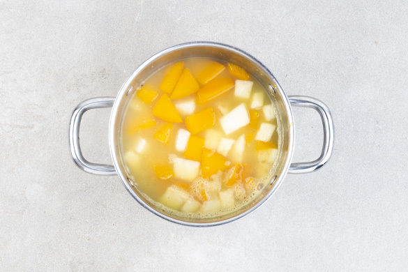 Den Kürbis halbieren, entkernen und in 2–3cm große Stücke schneiden. Den Sellerie schälen und ebenfalls in 2–3cm große Stücke schneiden. Das Gemüse in einem mittelgroßen Topf mit 1–2EL Olivenöl bei mittlerer Hitze 2–4Min. anbraten. Mit Salz und Pfeffer würzen, dann 900ml warmes Wasser angießen und das Gemüse in ca. 15Min. gar kochen.
