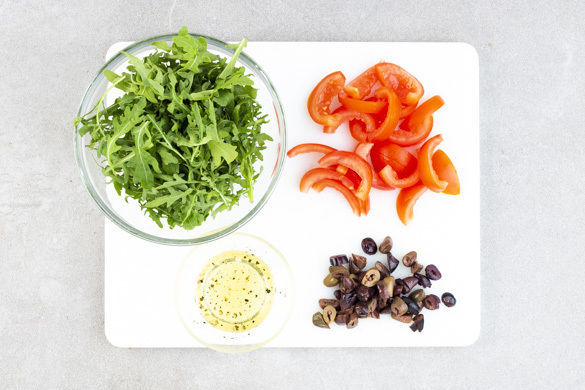 Den Rucola ggf. verlesen. Die Tomaten vierteln und den Strunk entfernen. Die Tomatenkerne auslösen und beiseitestellen, dann die Tomaten in dünne Streifen schneiden. Die Oliven in dünne Ringe schneiden. Aus 1EL Olivenöl, 2EL Essig, je 1/2TL Salz, Pfeffer und Zucker ein Dressing anrühren.