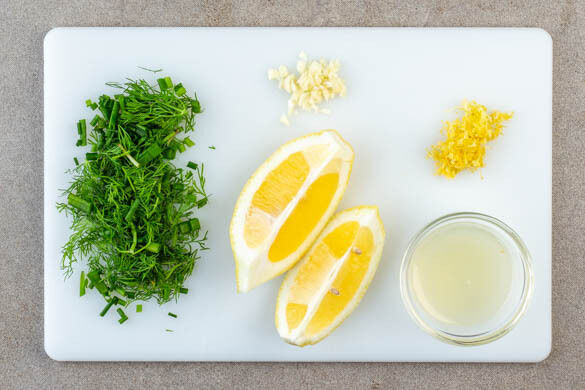 Den Schnittlauch und den Dill grob schneiden. Den Knoblauch schälen und grob würfeln. Die Zitronenschale fein abreiben und die Zitrone halbieren, eine Hälfte auspressen, die andere Hälfte in Spalten schneiden.