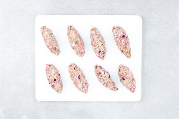 Das Hackfleisch mit den Zwiebelwürfeln, dem Knoblauch, der restlichen Gewürzmischung nach Geschmack und 1 Ei gut verkneten. Nach Belieben mit Salz und Pfeffer würzen. Aus der Masse ca. 16 gleich große Kugeln formen, diese leicht flach drücken und in eine ovale Form bringen.