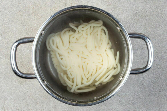 Die Nudeln in das kochende Wasser geben und in 2–3Min. bissfest kochen, dabei zwischendurch umrühren, um die Nudeln voneinander zu trennen. In ein Sieb abgießen und kalt abschrecken.