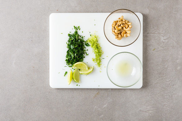 Die Cashews mit 1EL Olivenöl und der restlichen Gewürzmischung mischen. Die Petersilie samt Stängeln fein hacken. Die Limettenschale abreiben und die Limette halbieren, eine Hälfte auspressen, die andere Hälfte in Spalten schneiden.