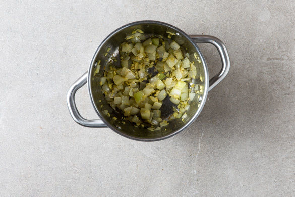 Die Zwiebeln und den Ingwer in einem mittelgroßen Topf mit 1EL Olivenöl bei mittlerer Hitze 1–2Min. anbraten. Mit Salz und Pfeffer würzen.
