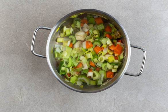 Den Lauch, den Sellerie, den Knoblauch und die Karottenwürfel in einem großen Topf mit 2EL Olivenöl und 1 kräftigen Prise Salz bei mittlerer bis starker Hitze 3–4Min. anbraten, bis der Lauch glasig und weich ist.