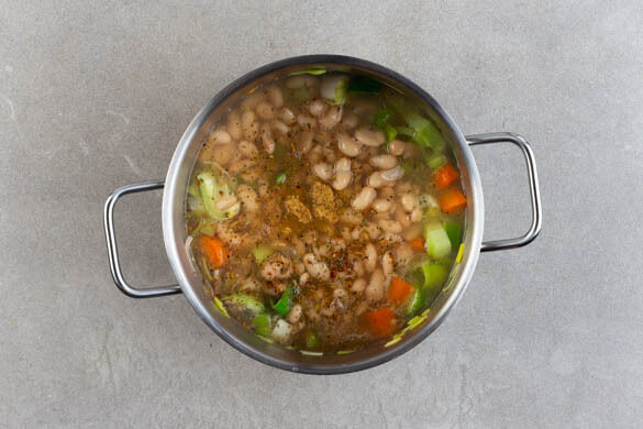 Die Bohnen samt Flüssigkeit, das Brühgewürz, die Gewürzmischung und 800ml Wasser in den Topf geben, aufkochen und abgedeckt bei mittlerer Hitze 15–17Min. köcheln lassen, bis das Gemüse weich ist.