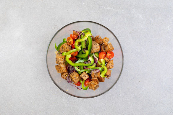 Heute frönen wir der leichten italienischen Küche und servieren zart gebratene, mehlierte Filetschnitzel aus dem saftigen Brustfleisch des Huhns. Dazu gibt es einen frischen, bunten Salat „Panzanella-Art“ mit grüner Paprika, Tomaten-Zwiebel-Gemüse, frischem Basilikum und gerösteten Croûtons. Buon appetito!