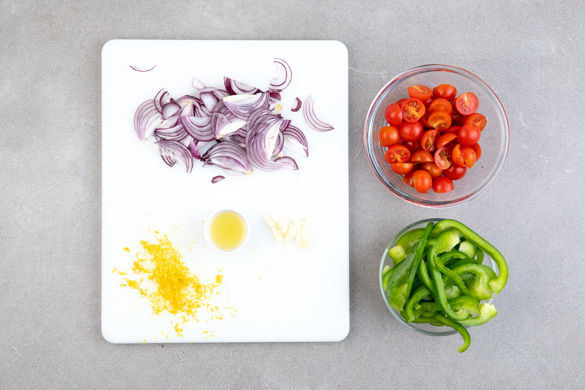 Den Backofen auf 220°C (200°C Umluft) vorheizen. Die Zwiebel und den Knoblauch schälen, halbieren und in feine Streifen schneiden. Die Tomaten halbieren. Die Paprika vierteln, entkernen und in dünne Streifen schneiden. Die Zitronenschale fein abreiben, dann die Zitrone halbieren und auspressen.