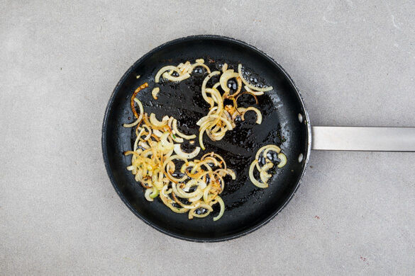 Die Zwiebeln in einer mittelgroßen Pfanne mit 1EL Butter bei mittlerer Hitze 1–2Min. anbraten. Dann 1 Prise Salz unterrühren und die Zwiebeln bei mittlerer bis niedriger Hitze unter gelegentlichem Rühren noch 5–7Min. braten, bis sie goldbraun und weich sind.