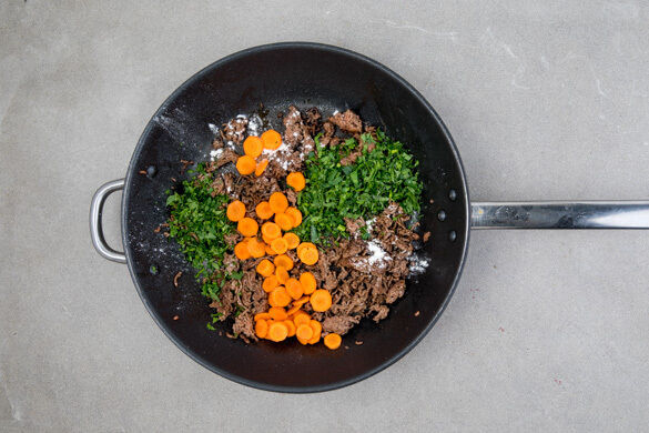 Die Petersilie samt Stängeln fein schneiden. Die Karotte ggf. schälen, in dünne Scheiben schneiden und mit der ½ der Petersilie sowie 1EL Mehl zum Hackfleisch in die Pfanne geben und ca. 2Min. mitbraten.