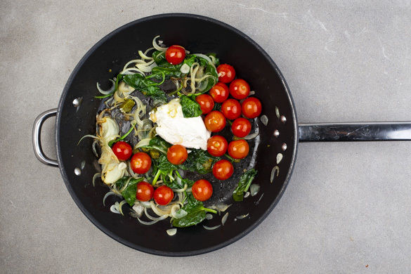 Wenn leichte Röstspuren am Knoblauch zu sehen sind, ca. ¾ des Spinats nach und nach hinzugeben und schwenken, bis er zusammengefallen ist. Die Kirschtomaten dazugeben und heiß werden lassen. Die Pinienkerne in einer kleinen Pfanne ohne Zugabe von Fett bei mittlerer Hitze 1–2Min. goldbraun anrösten, dann aus der Pfanne nehmen. Vorsicht, sie können schnell zu dunkel werden.