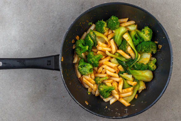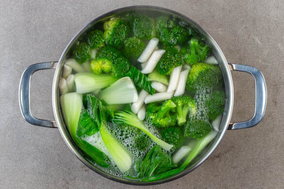 Die Reiskuchen in ein Sieb abgießen, mit dem Brokkoli und dem Pak Choi ins kochende Wasser geben und ca. 5Min. garen, bis das Gemüse bissfest und leuchtend grün ist.