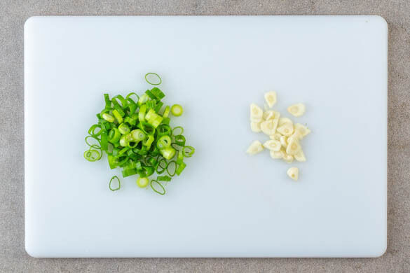 Inzwischen den Knoblauch schälen und in dünne Scheibchen schneiden. Die Lauchzwiebel in dünne Ringe schneiden. Das Gemüse in ein Sieb abgießen und mit kaltem Wasser abschrecken, um den Garprozess zu stoppen.