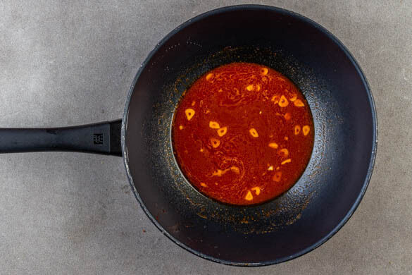 1EL Butter in einem Wok oder einer großen Pfanne bei mittlerer bis niedriger Hitze schmelzen. Den Knoblauch und die ½ der Chilipaste zugeben und unter gelegentlichem Rühren in ca. 1Min. duftend anbraten. Die Sojasauce, das Sesamöl, 100ml Wasser und 1TL Honig zugeben und ca. 3Min. köcheln lassen. Währenddessen den Käse fein reiben.