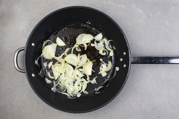 Die Zwiebeln und den Knoblauch in einer großen Pfanne mit 1EL Olivenöl und ½TL Salz bei mittlerer Hitze 1–2Min. anbraten.