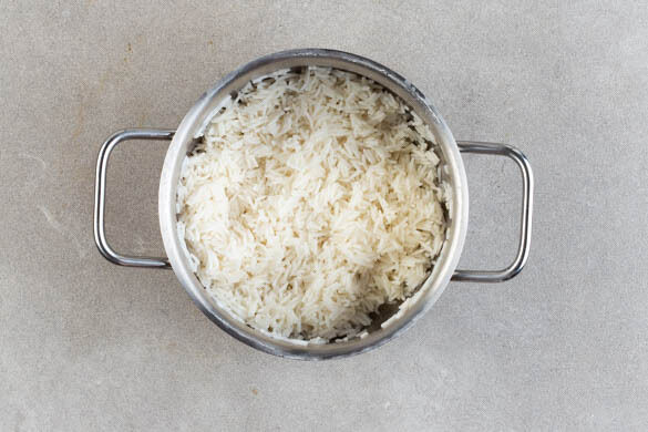 In einem mittelgroßen Topf 600ml leicht gesalzenes Wasser zum Kochen bringen. Den Reis in einem Sieb kalt abspülen, bis das Wasser klar bleibt. Sobald das Wasser kocht, den Reis hineingeben und abgedeckt bei niedrigster Hitze 12–14Min. kochen, bis das Wasser aufgesogen und der Reis gar ist. Noch ca. 5Min. ohne Hitzezufuhr ziehen lassen.