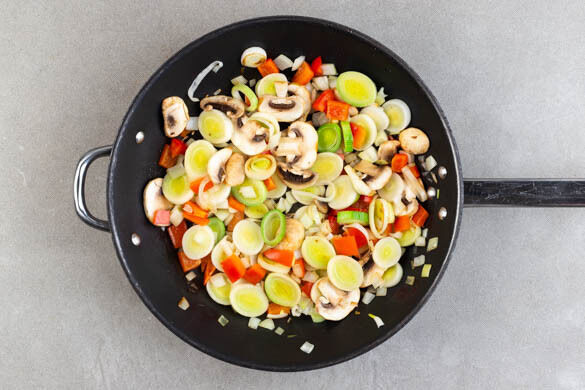 Den Gemüsemix in einer großen Pfanne mit 2EL Pflanzenöl und je 1 kräftigen Prise Salz und Pfeffer bei mittlerer bis starker Hitze ca. 3Min. anbraten, bis die Zwiebeln und der Lauch weich sind.