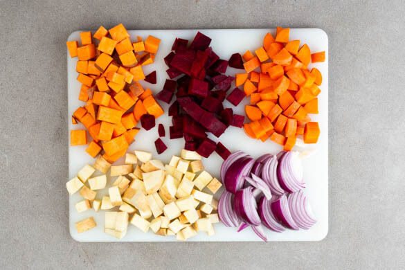 Den Backofen auf 200ºC (180ºC Umluft) vorheizen. Die Roten Beten schälen und würfeln. Tipp: Da Rote Bete stark färbt, beim Verarbeiten am besten Küchenhandschuhe und Schürze tragen. Die Zwiebeln schälen, halbieren und in Spalten schneiden. Die Karotten ggf. schälen und mit den Pastinaken und den Süßkartoffeln samt Schale in grobe Würfel schneiden.
