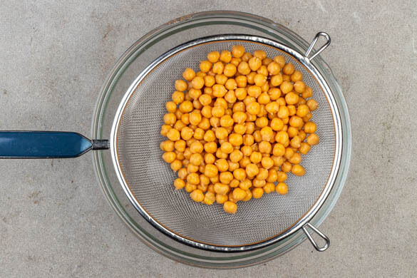 Den Backofen auf 240°C (220°C Umluft) vorheizen. Die Kichererbsen in einem Sieb mit kaltem Wasser abspülen und abtropfen lassen, dann mit etwas Küchenkrepp trocken tupfen, damit sie schön knusprig werden.