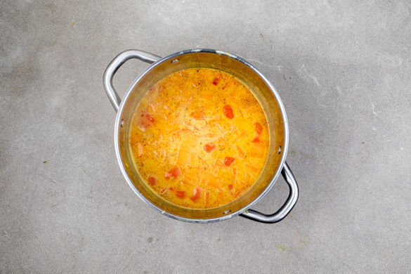 In einem zweiten Topf 1EL Pflanzenöl auf hoher Stufe erwärmen. Je nach gewünschtem Schärfegrad 1TL Currypaste im heißen Öl ca. 1Min. anbraten, bis es duftet. Mit der Kokosmilch und 550ml Wasser ablöschen und zum Kochen bringen. Die Süßkartoffeln, den Ingwer und das Brühgewürz dazugeben und die Suppe erneut aufkochen.