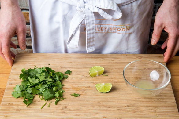 Die Limette halbieren und eine Hälfte auspressen, die andere Hälfte in Spalten schneiden. Den Koriander samt Stängeln grob schneiden. Das Curry mit 1–2EL Limettensaft abschmecken, auf Teller verteilen und mit dem Koriander und den Limettenspalten garniert servieren.