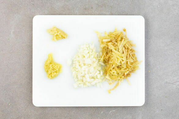 Das Hackfleisch mit der Knoblauch-Ingwer-Paste, den geriebenen Äpfeln und der Chilipaste vermengen.