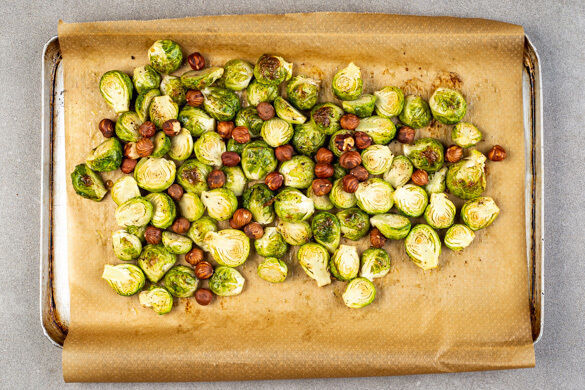 Den Rosenkohl halbieren, auf einem mit Backpapier ausgelegten Backblech mit 2EL Olivenöl, ½TL Salz und 1 kräftigen Prise Pfeffer vermengen und im Ofen 10–12Min. backen. Die Haselnüsse untermengen und den Rosenkohl mit den Nüssen weitere 5Min. rösten.