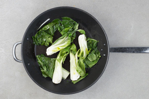 In einem mittelgroßen Kochtopf 600ml leicht gesalzenes Wasser für den Reis zum Kochen bringen. Die Karotten schälen, längs halbieren und schräg in ca. 1cm breite Streifen schneiden. Den Pak Choi halbieren oder ggf. vierteln, den Strunk entfernen.