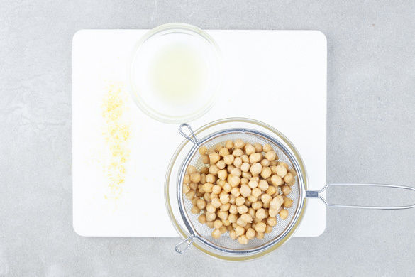 Die Kichererbsen in ein Sieb abgießen, dabei die Flüssigkeit auffangen. Die Zitronenschale abreiben, dann die Zitrone halbieren und auspressen.
