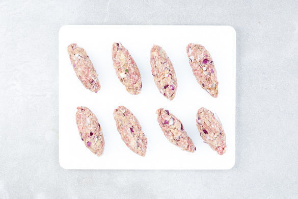 Das Hackfleisch mit den Zwiebelwürfeln, dem Knoblauch und den Semmelbröseln sowie Salz, Pfeffer und der Gewürzmischung nach Geschmack kräftig verkneten. Aus der Hackfleischmasse ca. 16 gleich große Kugeln formen, diese leicht platt drücken und in eine leicht ovale Form bringen.