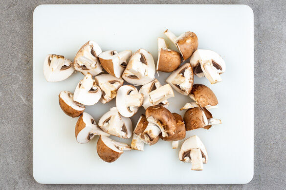In einem großen Topf ausreichend gesalzenes Wasser für die Nudeln zum Kochen bringen. Die Pilze ggf. säubern und je nach Größe halbieren oder vierteln.