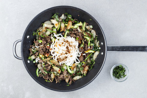 Den Pak Choi zum Hackfleisch in die Pfanne geben und 1–2Min. mitbraten. Dann die Gurken, die Lauchzwiebeln und den Knoblauch unterrühren und mit der Würzsauce ablöschen. Die Pfanne vom Herd nehmen.