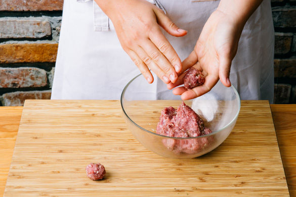Inzwischen den Knoblauch schälen und in möglichst feine Würfel schneiden. Das Hackfleisch mit der 1/2 des Knoblauchs sowie Salz und Pfeffer verkneten. Mit feuchten Händen etwa walnussgroße Hackbällchen formen.
