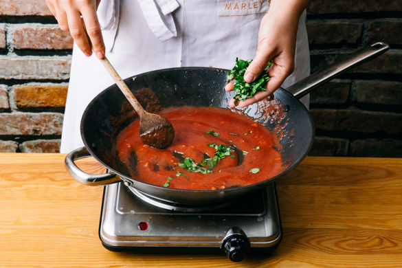 Die fertig gebratenen Hackbällchen aus der Pfanne nehmen, dann die passierten Tomaten in die Pfanne geben und mit 1 Prise Zucker, dem restlichen Knoblauch und der restlichen Gewürzmischung abschmecken. Die 1/2 des Basilikums unterrühren. Die Hackbällchen dazugeben und 4–5Min. in der Sauce mitköcheln lassen. Nach Wunsch mit Salz und Pfeffer nachwürzen.