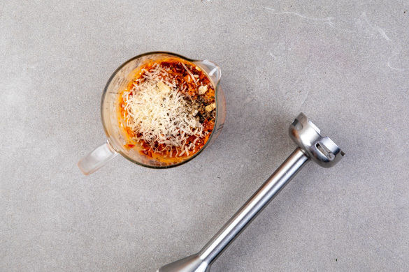 Ca. 1/3 der Kirschtomaten mit den getrockneten Tomaten, der 1/2 der Rauchmandeln, dem Knoblauch, ca. 3/4 der Basilikumblätter, 3–4EL Olivenöl sowie Salz und Pfeffer in einem hohen Gefäß zu einem cremigen Pesto pürieren. Den Käse unterrühren und mit Salz und Pfeffer nach Geschmack nachwürzen.