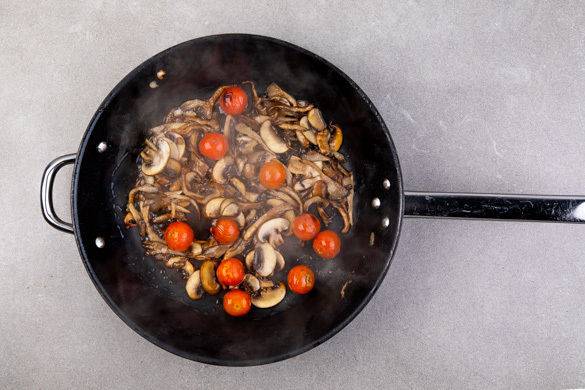 Die restlichen Kirschtomaten zu den Pilzen in die Pfanne geben und ca. 3Min. mitbraten, bis die Haut aufplatzt.