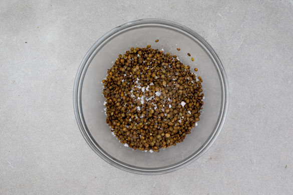 Die Linsen in einem Sieb kurz mit kaltem Wasser abspülen und abtropfen lassen. Mit 1L Wasser in einen mittelgroßen Topf geben und einmal aufkochen lassen, dann auf niedriger Hitze abgedeckt 25–30Min. sanft köcheln lassen, bis die Linsen gar sind.